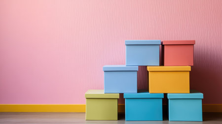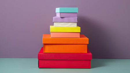 A vibrant display of stacked boxes in various pastel shades creates an eye-catching arrangement. Perfect for packaging, gifts, or creative projects that require colorful organization.