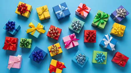 An overhead view displays numerous vibrantly colored gift boxes, each adorned with decorative bows. The presents, varying in size, are arranged against a bright blue surface. The composition uses high-angle lighting and presents a festive aesthetic suitable for commercial and editorial applications, conveying themes of celebration and giving.