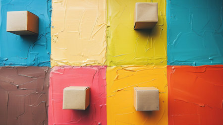 A colorful textured background with cardboard boxes attached to it, creating a modern and abstract art piece. The mix of colors and textures adds depth and interest.