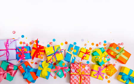 colorful boxes and confetti on a white isolated background.