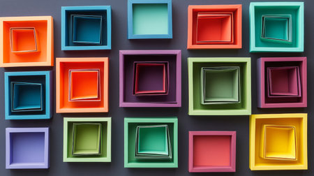 A stunning display of colorful nested squares in various vibrant shades arranged artfully against a dark background, perfect for creative inspiration and design projects.