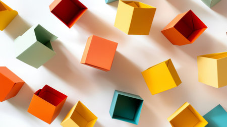 A lively scene featuring assorted colorful paper boxes artistically scattered on a white surface, ideal for design projects, creative themes, and modern decor ideas.
