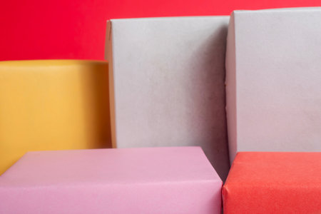 A vibrant assortment of square and rectangular gift boxes in pink, yellow, red, gray, and pastel colors create a festive packaging display. Perfect for holidays, celebrations, gift giving, and promotional displays.