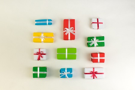 Multicolored gift boxes. Celebration, birthdays, Christmas and branding. Packaging. Top view. Christmas gifts.