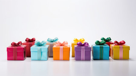 A cheerful collection of gift boxes in colorful wrapping, tied with bows and ribbons, perfectly arranged on a white surface.