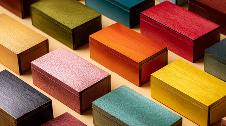 Brightly colored boxes are carefully stacked, showcasing a variety of hues and patterns against a textured wall in a warm indoor atmosphere.