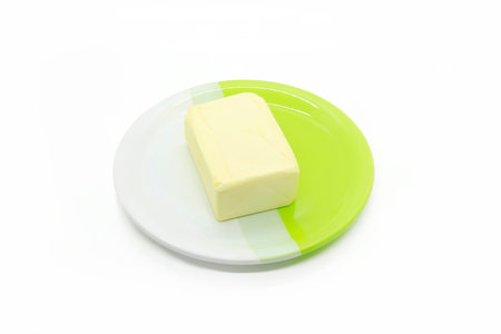 Piece of butter on a two-color plate isolated on a white background