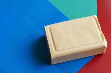 Laundry soap on a colorful background. A single rectangular piece of soap on a red-blue-green background. Demonstration of a single piece of new soap. Place for text. Top view at an angle