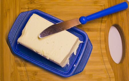 Butter in blue dish and knife on wooden background
