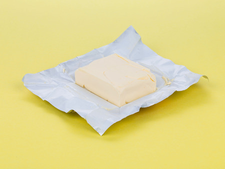 Creamy butter in its unwrapped foil paper. Isolated on light table