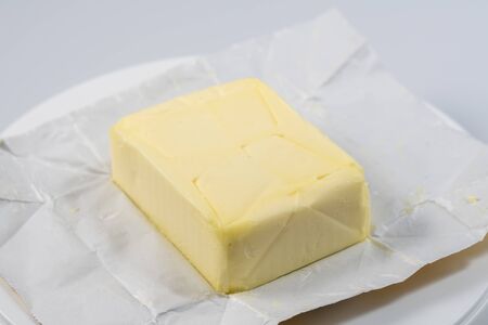 big butter brick with cracked made by foil package. Ivory block of butter laying on foil wrapping with cracks made by knife. Creamy butter in its unwrapped foil paper. Isolated on white Clipping Path