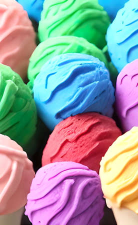 Many cups with colorful rainbow ice cream. Top view