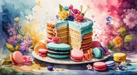 Digital watercolor. A set of sweets, a cake surrounded by macaroons decorated with flowers. Generative AI.