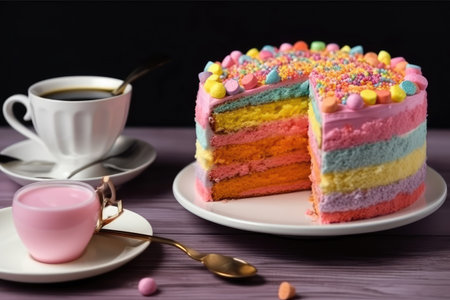Delicious and beautiful cake with rainbow colors, served with tea or coffee by generative AI