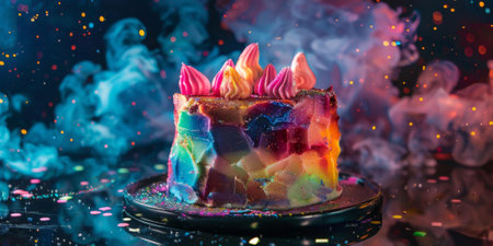 A vibrant slice of layered cake featuring bright colors and smooth frosting sits on a reflective surface, evoking joy and celebration. Perfect for parties!