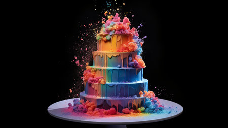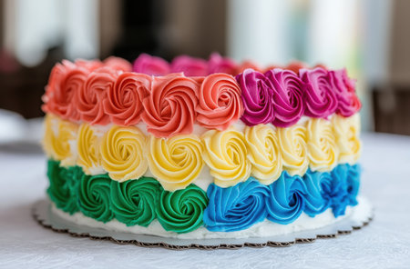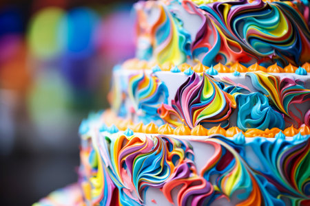 Exquisite layered cake adorned with colorful swirls of icing. Perfect for celebrations, bakery promotions or party designs, showcasing art of cake decoration. Concept of joy and creativity