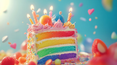 A vibrant rainbow cake decorated with colorful sprinkles and candles, perfect for any celebration. Captures the joy and sweetness of special moments.