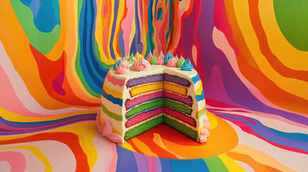 A stunning rainbow cake with vibrant layers and playful frosting sits against a lively, multicolored backdrop, evoking joy and celebration.