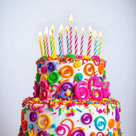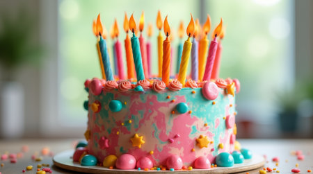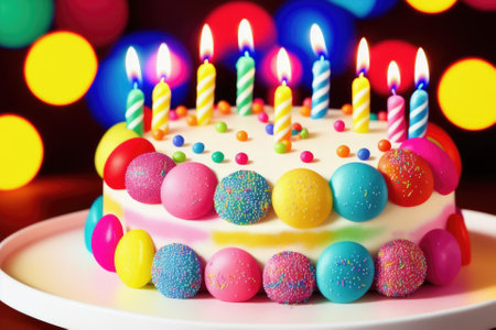 Colorful birthday cake with candles lit for a celebration in a festive atmosphere