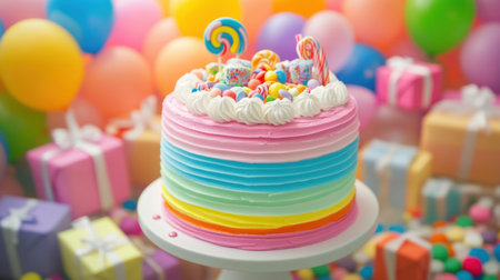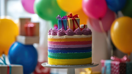 A beautifully decorated rainbow cake stands at the center of a lively party scene, surrounded by colorful balloons and presents, perfect for any joyful celebration.