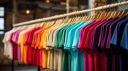 Generative AI, Colorful t-shirts on hangers, apparel background, print on demand concept, cloth store