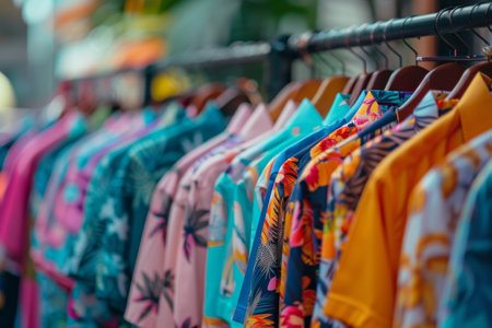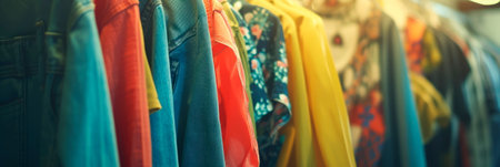 Close-up view of a boutique clothing rack with various stylish garments, textures, and vibrant colors in a trendy store. concept of fashion, clothing diversity, retail style.