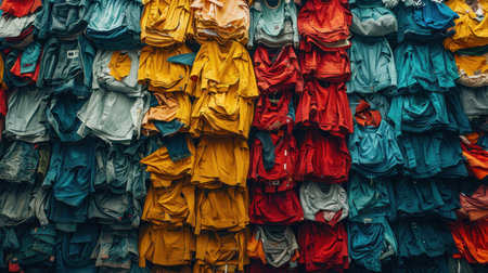 T-shirts made of multicolored fabric stacked in piles
