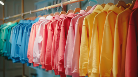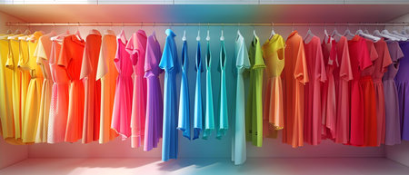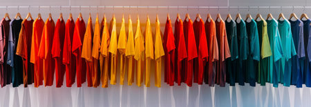 Colorful row of neatly hung shirts displaying gradient spectrum on wooden hangers in clothing store setting. concept of fashion, organization, retail display, copy space , banner.