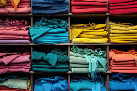 A vibrant assortment of neatly folded scarves arranged in contrasting colors on wooden display shelves