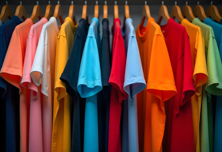Colorful T-Shirts in a Row. Ideal for fashion, wardrobe, and retail themes, for casual wear, clothing stores, and style