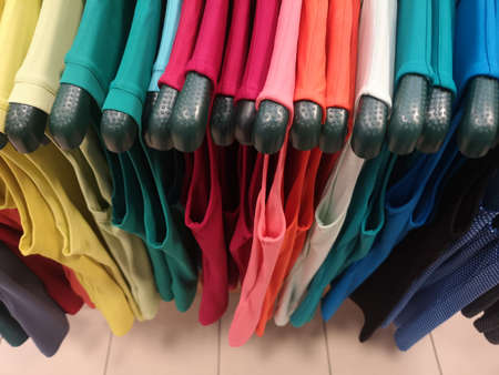 Colorful t-shirts and polo shirts. Preparation for the spring season. Shopping. Close-up. Clothing concept.
