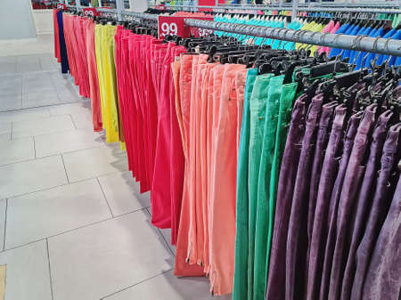 Rows of Colorful Trousers Hanging on the Racks at Clothing Store