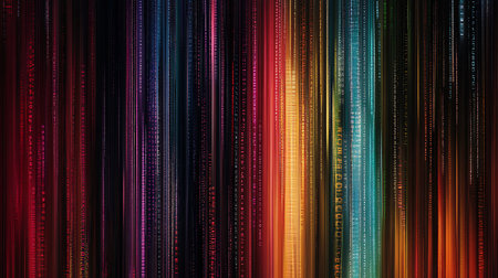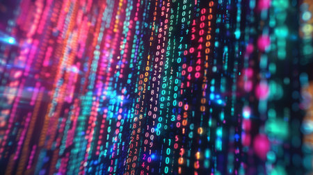 A vibrant abstract background with multicolored binary code, representing data, technology, and digital concepts. Ideal for futuristic and tech-related themes.