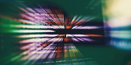 Colorful, angled close-up shows digital lines of text in a blurred, artistic rendering