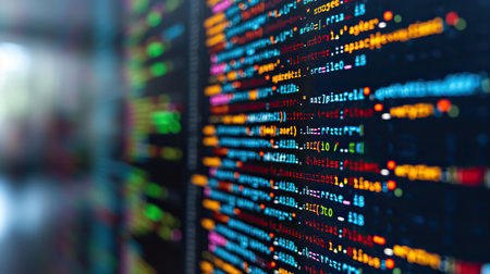 Vibrant display of colorful code snippets on a dark background, representing programming languages, algorithms, and creative technological solutions in a digital environment.