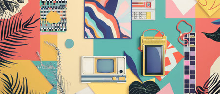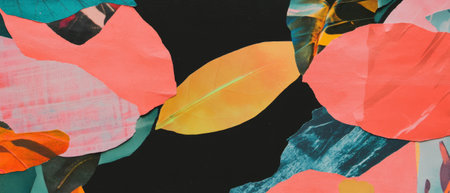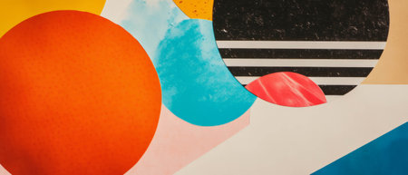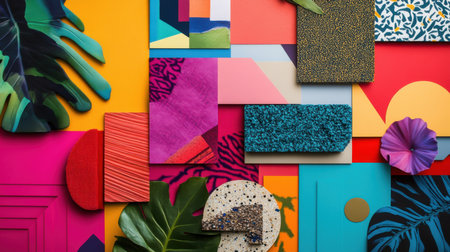 Creative minimalistic scrapbook collage with textured surfaces and vibrant cutouts