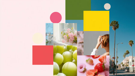 Colorful collage featuring vibrant fruits, flowers, and a sunny urban landscape with palm trees and bright geometric shapes