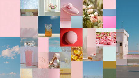 Colorful collage of pastel items and landscapes depicting a cheerful summer vibe in a bright, sunny location