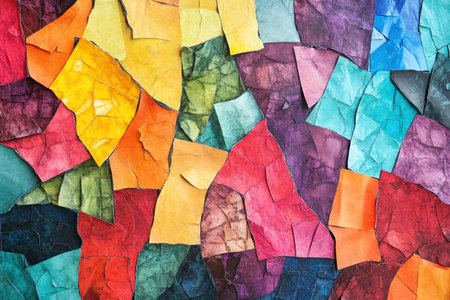 A close-up abstract image of a collage made of various colored paper fragments.