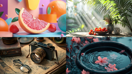 Colorful collage featuring fruits, vintage cameras, and floral elements in natural light. A blend of creativity and nostalgic charm.