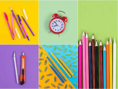 Collage photos of various stationery on background of multicolored paper. Back to school concept.
