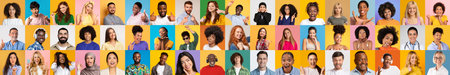 Collage made of portraits different people of diverse gender and age smiling, showing positivity against multicolored background