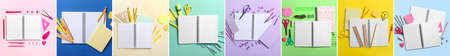 Set of notebooks with stationery on color background, top view