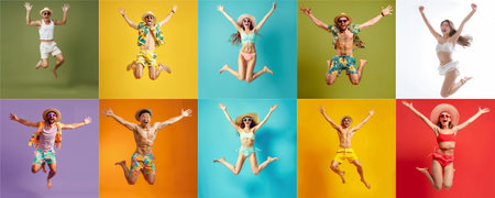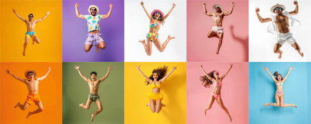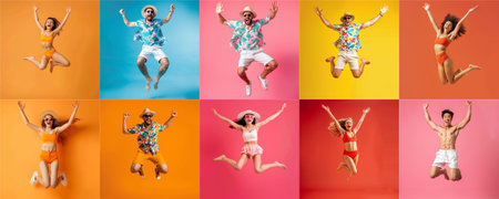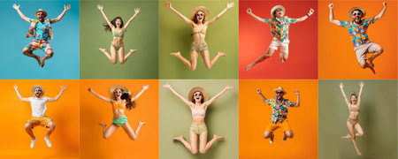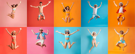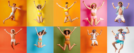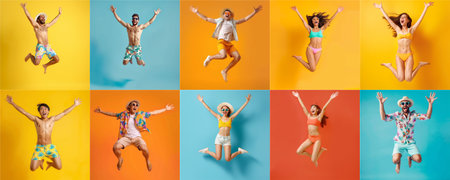 Summer people collection set, diverse people jumping on colorful background, many people funny jump wearing summer outfit fashion ready for swim and summer activity, summertime, beachwear AIG48