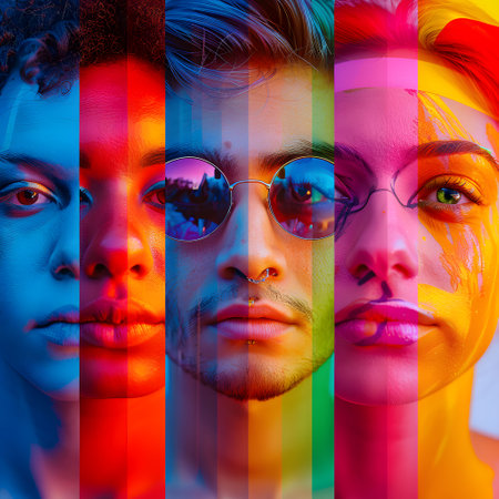 Four diverse faces illuminated by vibrant, multicolored light, symbolizing unity and celebration during Pride Month.
