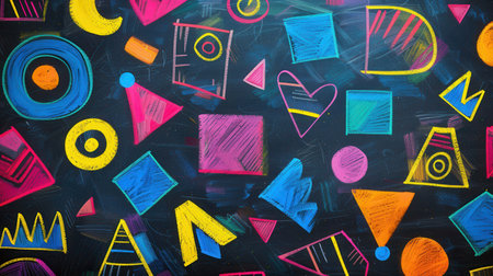 Colorful geometric shapes and patterns cover the blackboard, showcasing creativity during an art activity in a classroom.
