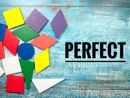 Business concept.Text PERFECT with wooden jigsaw on blue wooden background.