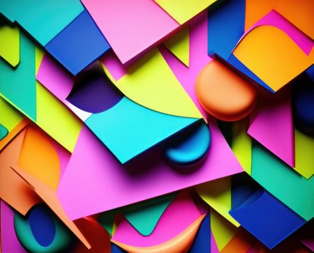 A vibrant collection of colorful geometric shapes and forms creates a playful and artistic scene. Perfect for creative projects, design inspiration, or educational materials.