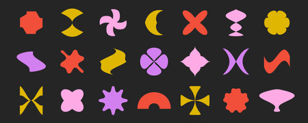 Abstract stars, flowers, waves, crosses shapes collection. Primitive geometric forms set in Swiss, bauhaus or Memphis style. Brutalist elements pack for poster, banner, collage. Vector signs bundle.