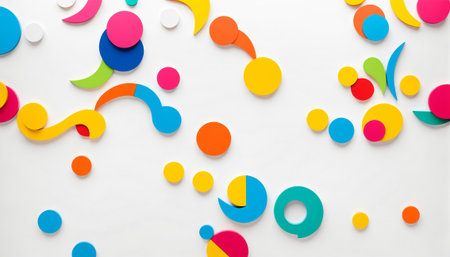 Colorful abstract geometric shapes create dynamic visual interest, blending bright circles and squares on a neutral background, ideal for modern art enthusiasts or design projects